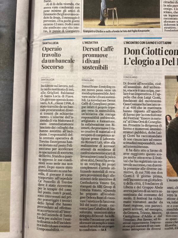 Racconta Lara Caballini di Sassoferrato, Amministratrice Delegata di Dersut Caffè: “Quando ho proposto all’ecodesigner Debora Basei di rinnovare l’estetica e la funzionalità dei nostri divani, ha subito colto l’occasione per trasformare un semplice intervento di arredo in un progetto condiviso, capace di generare valore per l’ambiente e per le persone.